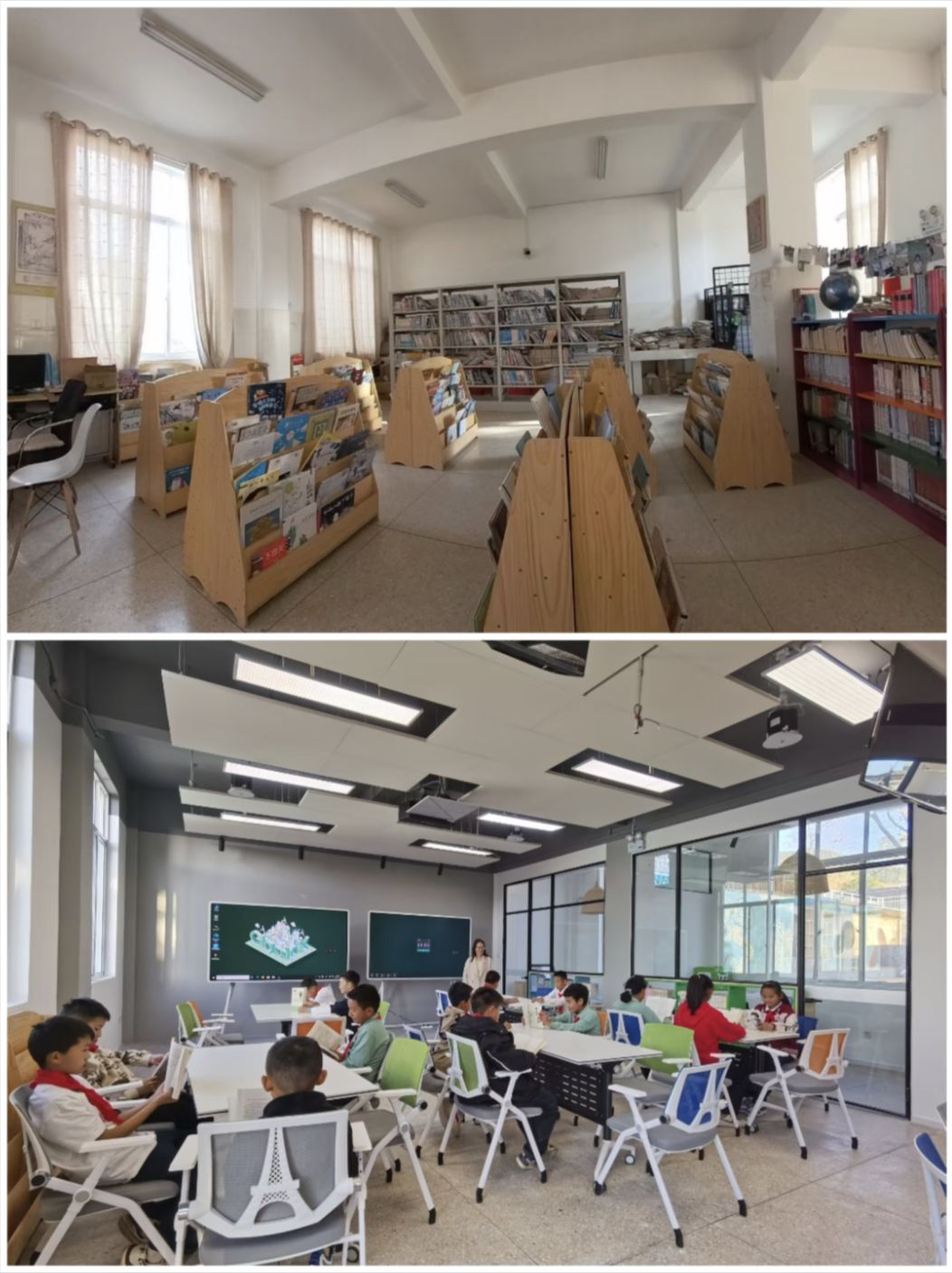 历时近一年,我们与当地教师、村民、设计师一起,在图书馆增添了光影温暖的色彩、座椅更多样的分区和更多功能的设备,包括沉浸式艺术装置;